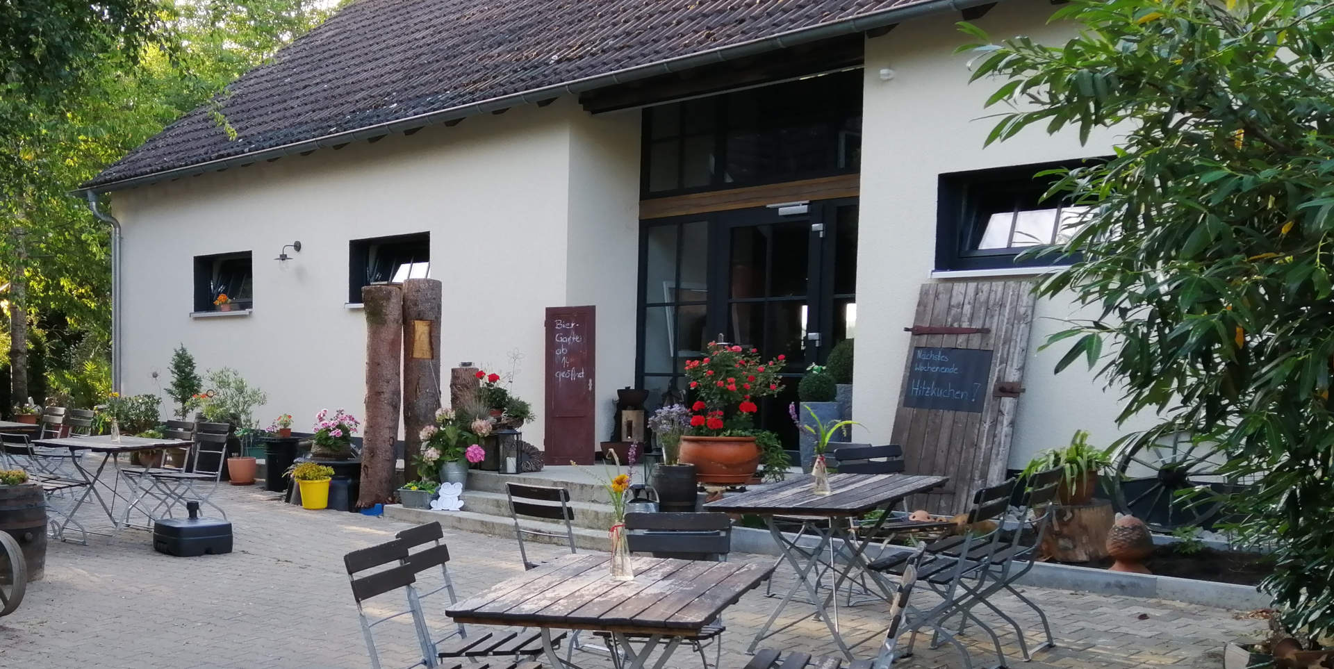 Angrenzend zur Land-Wirtschaft befindet sich der gemütliche Biergarten, Hier gibt es Platz für ca. 50 Personen. Dicht bewachsen mit Bäumen und einem Teich lädt er ein unter freiem Himmel ein paar gemütliche Stunden zu verbringen.